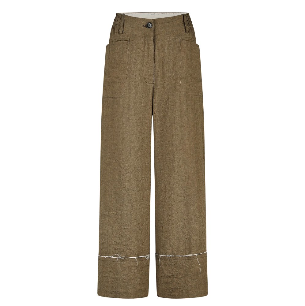 High-rise, wide leg trousers from Annette Gortz. Crafted from a rich linen-cotton fabric, these khaki trousers are finished with a white raw-edge trim. The khaki is a rich green-brown colour, made even more special by the beetled-effect finishing.