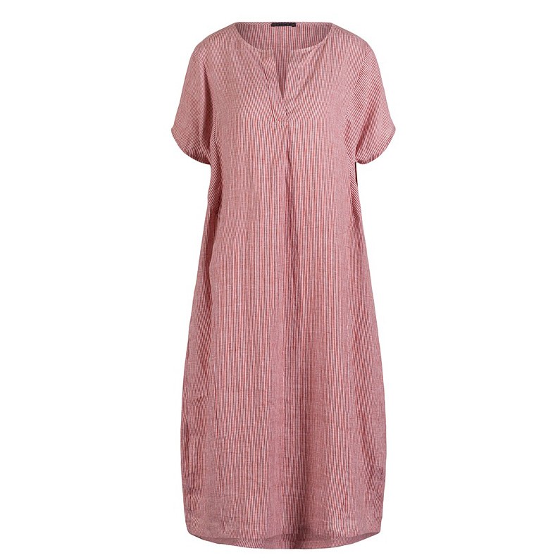 Striped linen dress in a rich 'Picante' red colour. Fitted shoulders give way to an airy, relaxed skirt. Scooped neckline with 'V' detail that opens into pleat.