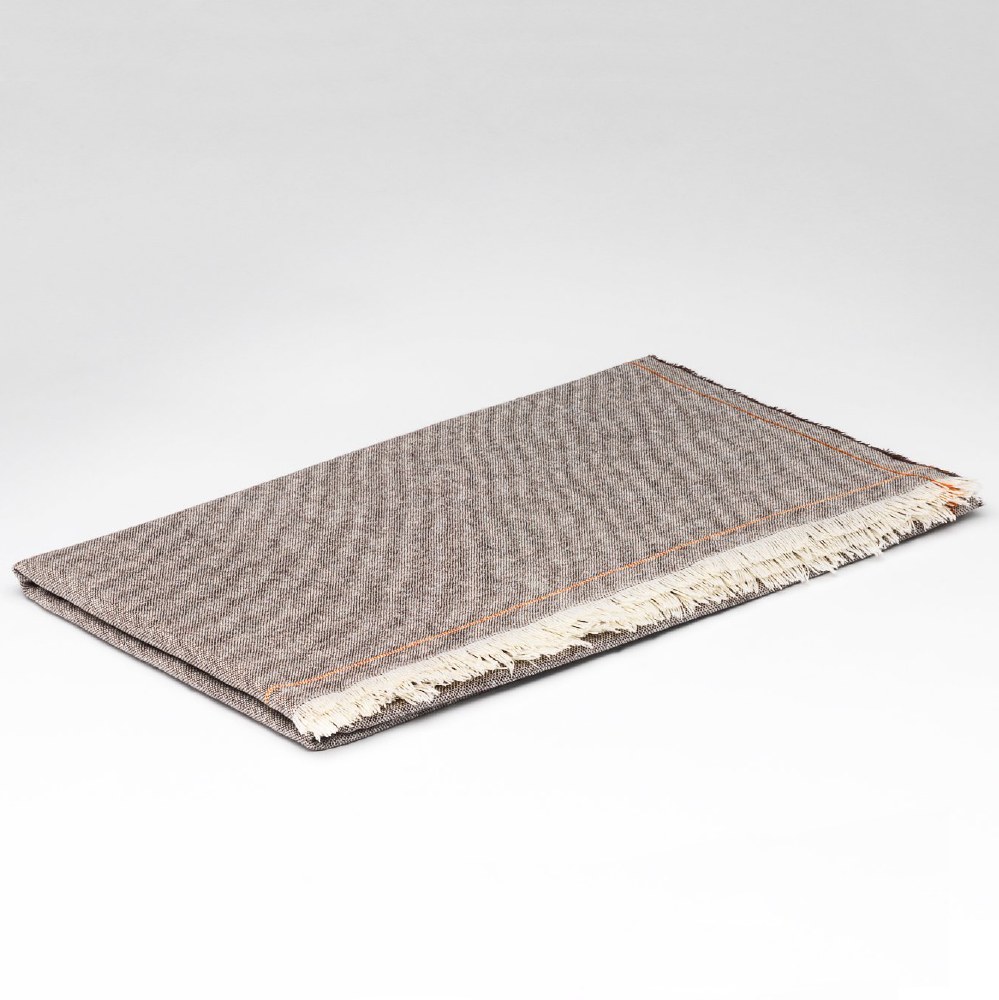 Merino lambswool and cashmere blend wrap woven in County Donegal, Ireland. Toffee brown colour with a fine orange border trim.